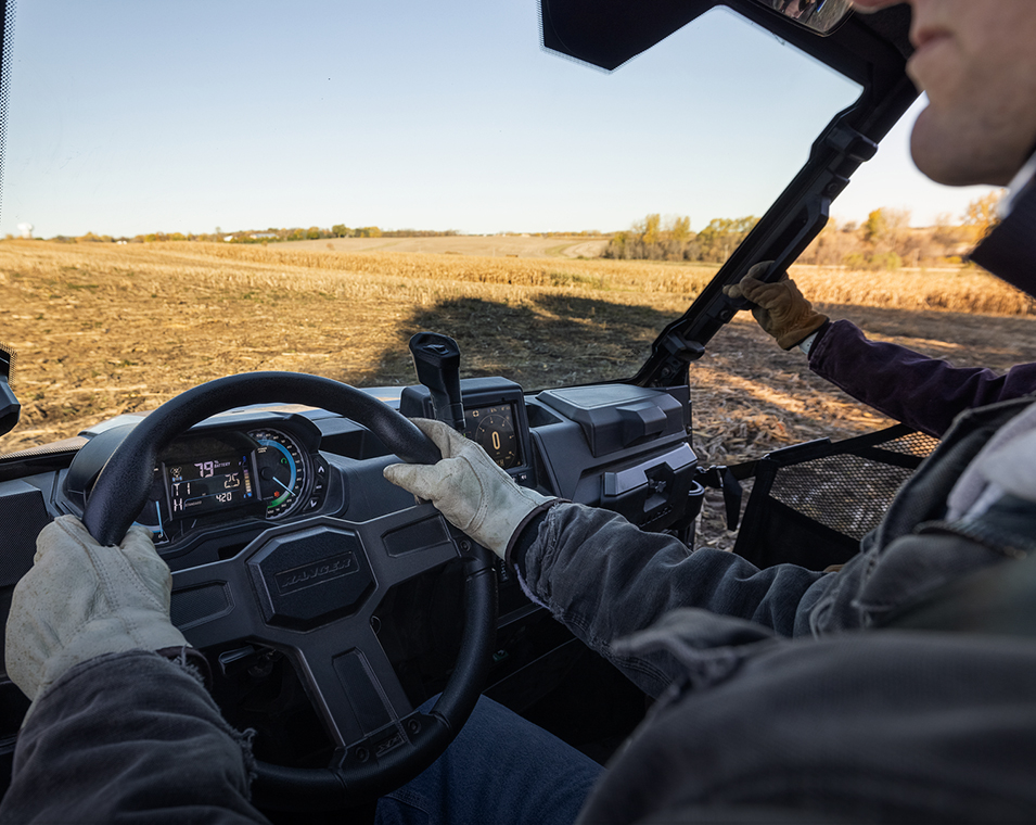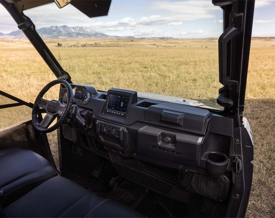 Zentrales, mit Handschuhen bedienbares 7-Zoll-Touch-Display mit EV-Infotainment (inkl. Restreichweite, Batterieladestand, Ladestatus, Startanzeige, Systemdiagnose und mehr), Geschwindigkeitsbegrenzer, Pflugmodus, *Gruppenfahrt, *GPS-Navigation, Lufttemperatur, Bluetooth, AM/FM-Radio. Doppelte analoge Ziffernblätter auf der Fahrerseite mit 4 Zoll großem Multifarb-LCD-Fahrerinformationszentrum: Stromverbrauch und Energierückgewinnung in %, Batterieladestand in %, verbleibende Reichweite, Ladestrom, Batterietemperatur, Motortemperatur, Spannung Zubehöranschlüsse, Geschwindigkeitsanzeige, Kilometerzähler, Tageskilometerzähler, Ganganzeige, Serviceanzeige und Codes, programmierbare Serviceintervalle, Sicherheitsgurt-Warner, vom Benutzer wählbare Hintergrundbeleuchtung und Helligkeit, Uhr. Premium-Sitze mit konturierten Rückenlehnen und gesticktem Polaris Logo, Premium-Lenkrad und Innenraum-Dekor, Polaris Pulse Electrical System (6 Anschlüsse), Gleichstrom-Steckdosen, Doppelte USB-Anschlüsse, 12V SAE-Anschluss an der Cargo Box mit Ein/Aus-Schalter im Armaturenbrett, Lautsprecher im Armaturenbrett, Rückfahrkamera, *Konnektivität via Ride Command + App